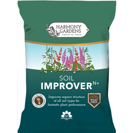 Peat-free and Carbon Neutral soil improver with added nitrogen. Green Compost blended with recycled wood fibre which releases additional nitrogen back to the plants. Harmony Gardens Soil Improver N+ is perfect for mulching around plants or digging into the soil.